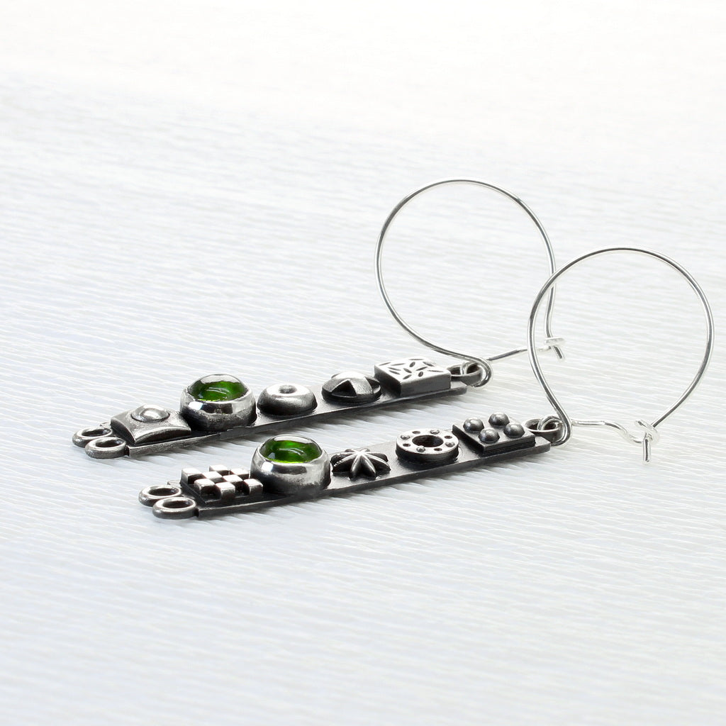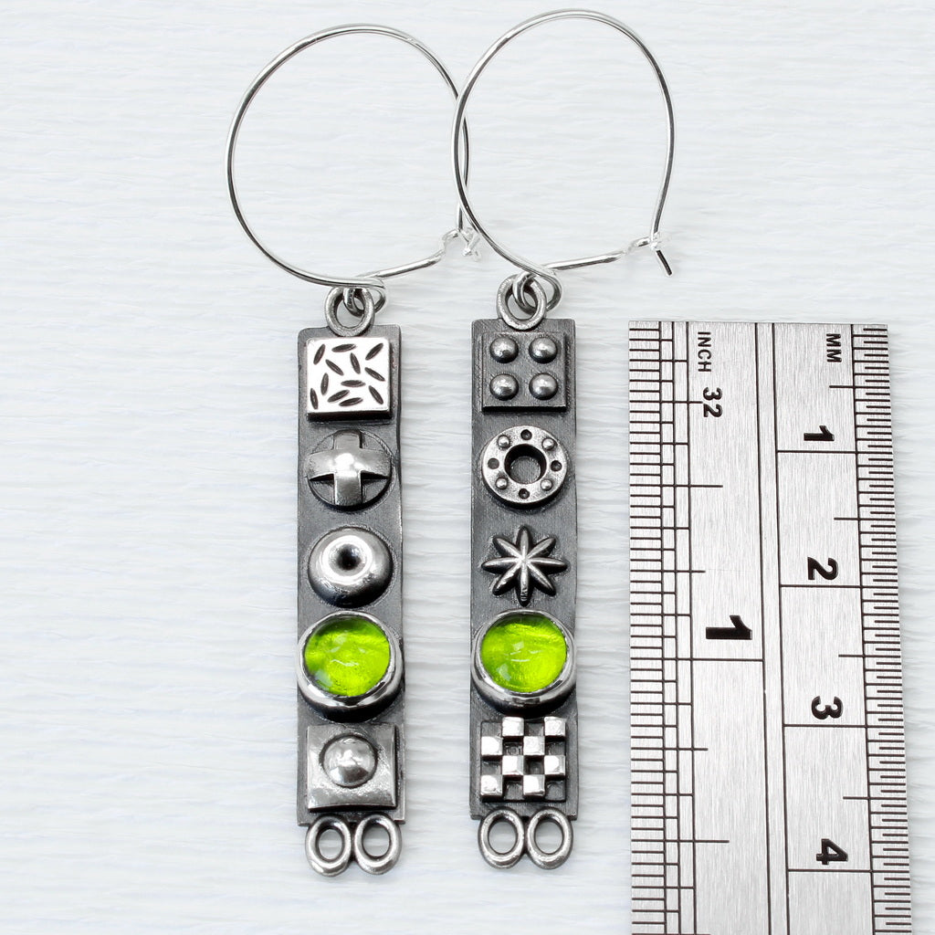 Long sterling silver earrings with 3D symbols and peridot gemstones by jewellers John and Dawn Field